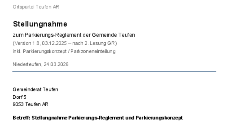 Im Rahmen der Mitwirkung zum kommunalen Parkierungskonzept und Parkierungsreglement der Gemeinde Teufen hat die FDP Teufen am Dienstagabend, 24.03.2026, eine differenzierte Stellungnahme erarbeitet. Details dazu finden Sie im angehängten PDF.